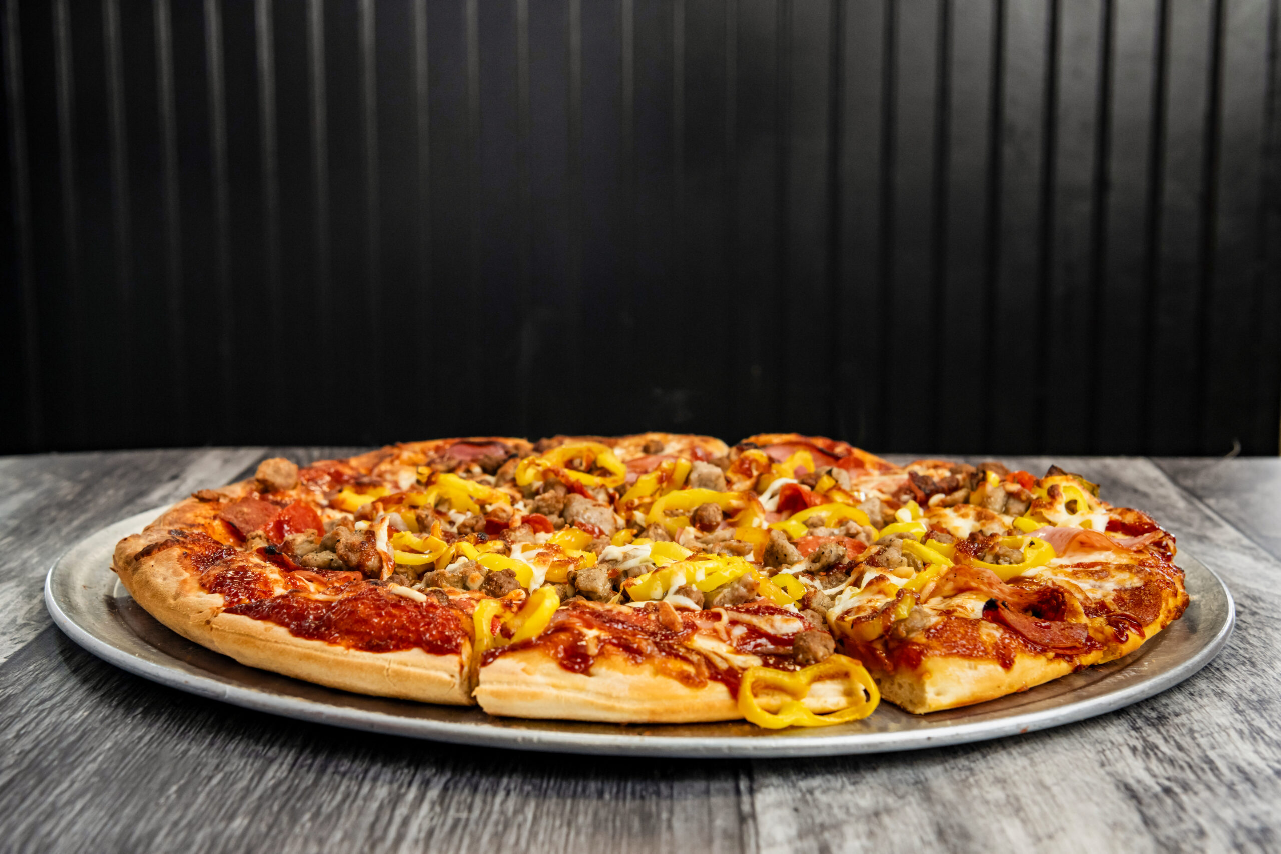 BBQ sauce, Salami, Canadian Bacon, Pepperoni, Beef, Sausage, Pepperchinis